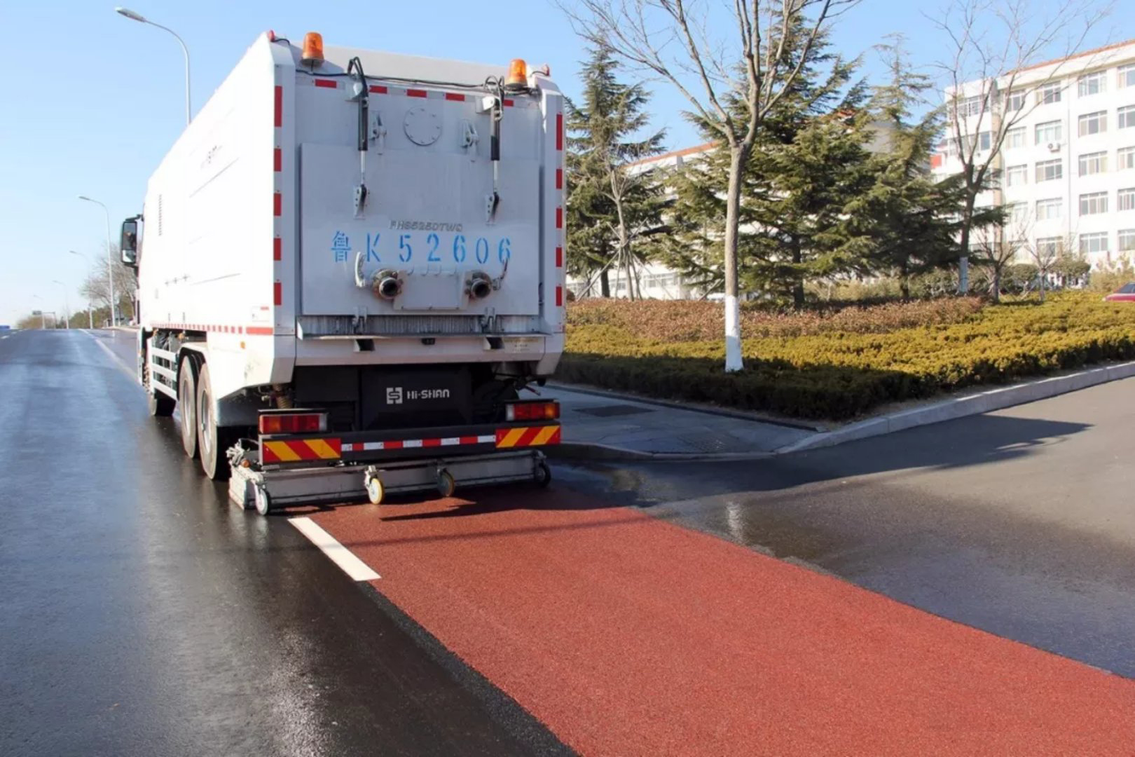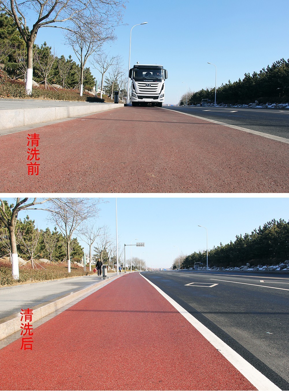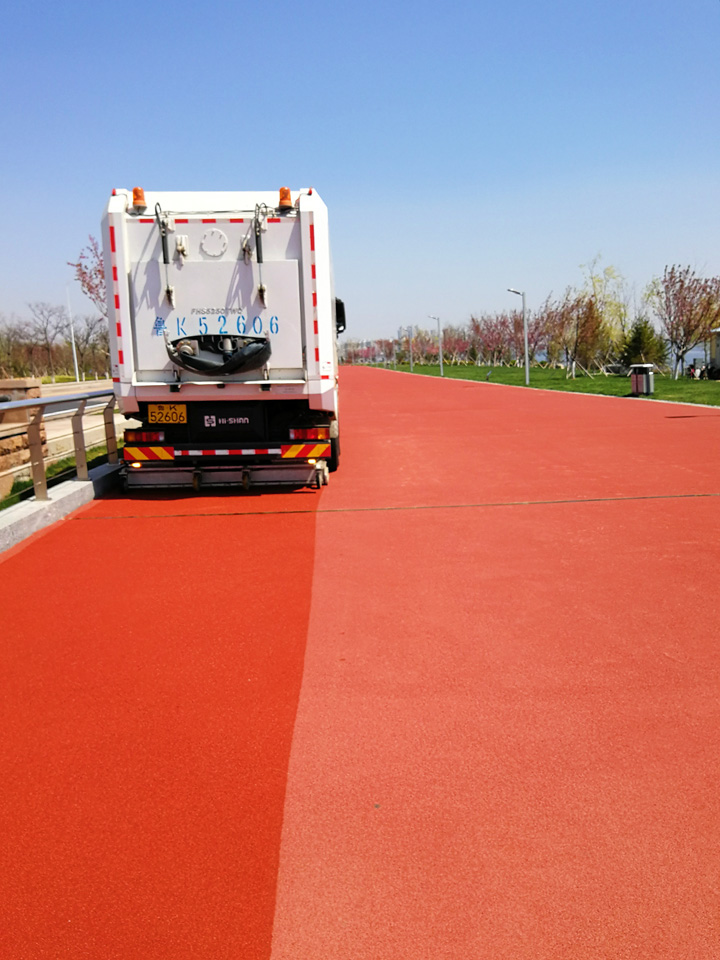 由它行駛之后的馬路,車后方的一條紅色瀝青路面凸顯,宛如剛剛鋪設(shè)完一樣嶄新道路,煥然一新,與兩側(cè)的車道形成鮮明對比,路面的透水縫隙、塑料顆粒清晰可見,路面白色標識線像剛噴涂過一樣的潔白,干凈整潔,效果突出,真正達到“席地而坐”的標準。市民們紛紛拿出手機拍照,并感嘆“路面從來沒見過掃的這么干凈,跟新鋪的一樣”。