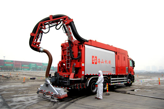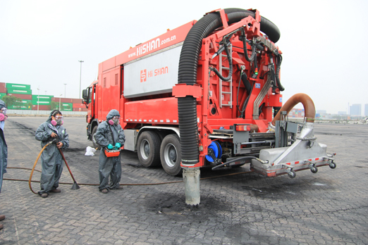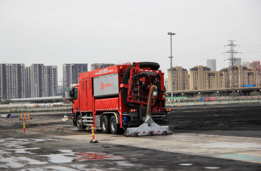 本次施工改變了傳統(tǒng)的由清掃車清掃作業(yè)、灑水車高壓沖洗、多種洗消設(shè)備聯(lián)合作業(yè)的施工模式,由一臺(tái)抽吸車即可完成,對(duì)污染物的清除率達(dá)到現(xiàn)場(chǎng)的環(huán)保施工要求。相對(duì)于傳統(tǒng)的作業(yè)方式,全密閉、無(wú)拋灑、地表清洗干凈,工作效率提升5倍以上。