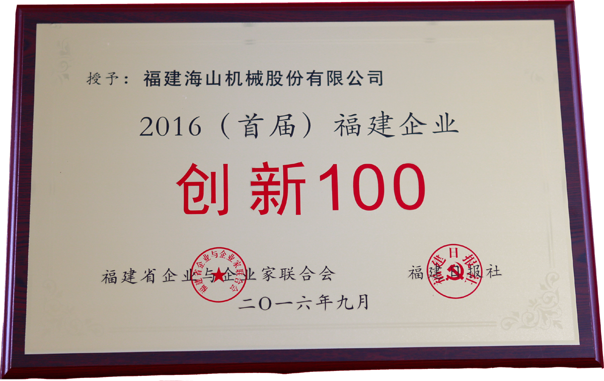 9月21日,2016年中國平潭?企業(yè)家科學家創(chuàng)新論壇在平潭舉行,論壇頒布了(首屆)福建企業(yè)“創(chuàng)新100”名單,并為兩岸產(chǎn)業(yè)創(chuàng)新聯(lián)盟授牌,海山機械入圍 “創(chuàng)新100”企業(yè)名單。評選是福建省首次由企業(yè)家、科學家、金融家作為評審主體,聯(lián)合媒體、智庫、經(jīng)濟社團共同發(fā)起的年度創(chuàng)新評價和創(chuàng)新服務(wù)活動。組委會在企業(yè)自主申報基礎(chǔ)上,圍繞國家創(chuàng)新綱要十大技術(shù)創(chuàng)新路線,遴選出百余家創(chuàng)新企業(yè)。