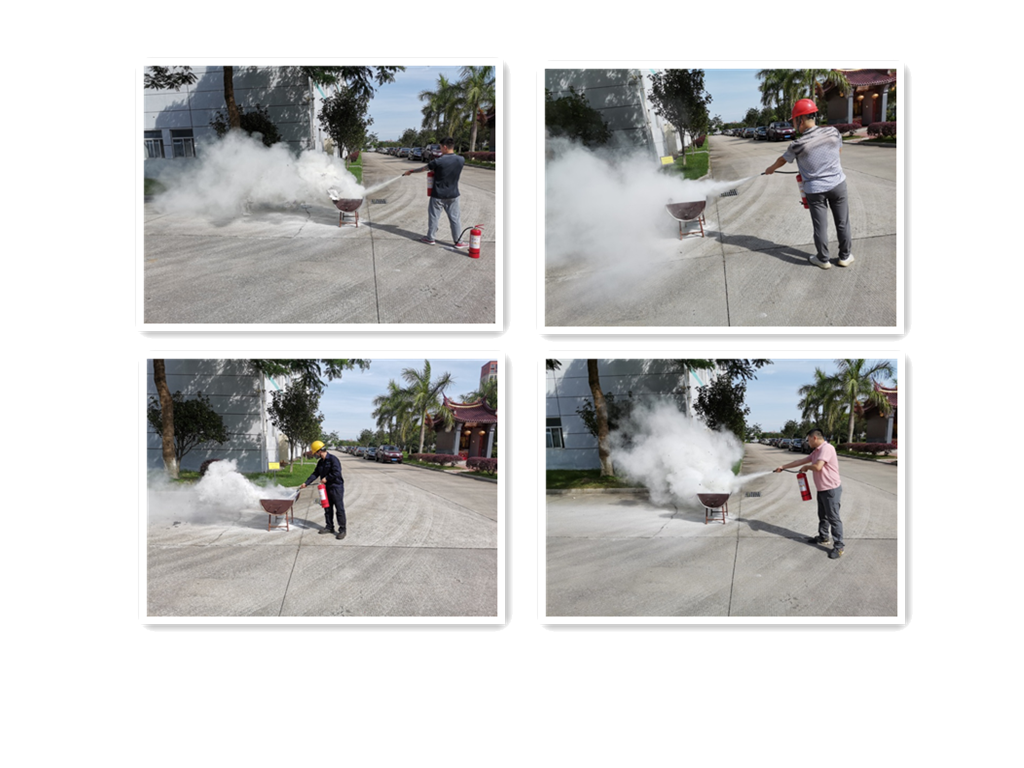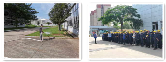 1、2022年6月24日下午14:30分左右,公司廠內制造車間因車輛添加液壓油時,不小心飛濺一些到放置車底下的紙皮上,調試人員未及時將含有液壓油的紙皮按要求進行處理。該車輛剛好有一項技改項目需要完成,配焊人員在焊接前未注意觀察車底情況,導致在焊接時火星不斷飛濺到含油紙皮上,于14:55分左右出現火情?,F場應急人員立即組織消防逃生及滅火,并立即報告應急辦公室,由應急辦公室立即向應急指揮部報告。應急指揮部根據初期火情控制情況(應急救援人員滅火得當,于14:56分左右使用滅火器將火撲滅)及預警級別(車間級),啟動車間級應急響應。相關部門配合做好應急響應工作,待達到應急終止條件后,終止應急響應。最后對現場進行洗消、并進行工作總結與評估。突發(fā)環(huán)境事件應急預案演練圖片如下: