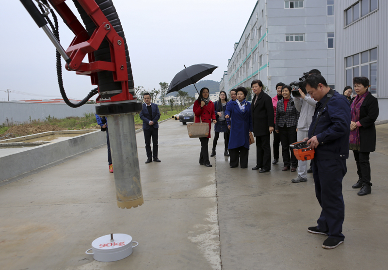 Lin Aiping and Huang Xinagyang introduce non-destruction suction technology and products, and walking excavator to Wu Hongqin. Then Wu watches the operations of Hishan walking excavator and Hishan suction excavator. During the report about Hishan program, Wu recognizes Lin Aiping’s success in turning investment from shoes manufacture to machinery manufacture, and highly prises the achievements made by the R&D group. Wu also points out that Hishan should overcome all difficulties at its best and turn innovation fruits in to enterprise benefit, and that the Fujian Women’s Federation fully supports Hishan and helps Hishan in its development.